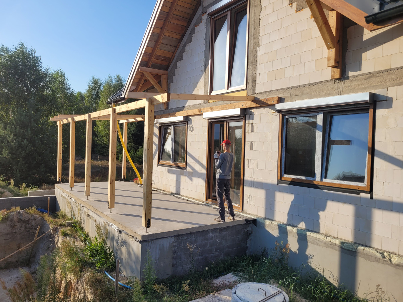 Udalo sie tez, z pomoca brata postawic konstrukcje zadaszenia tarasowego, tylko tam jeszcze sporo prac do ich pelnego ukonczenia.