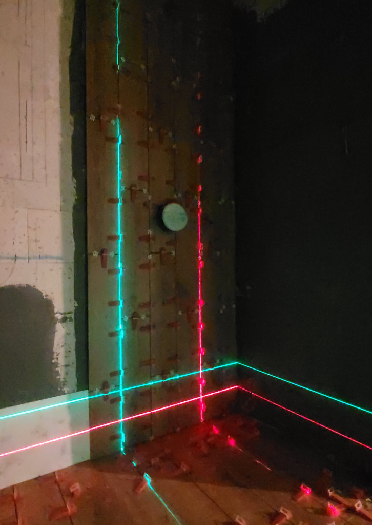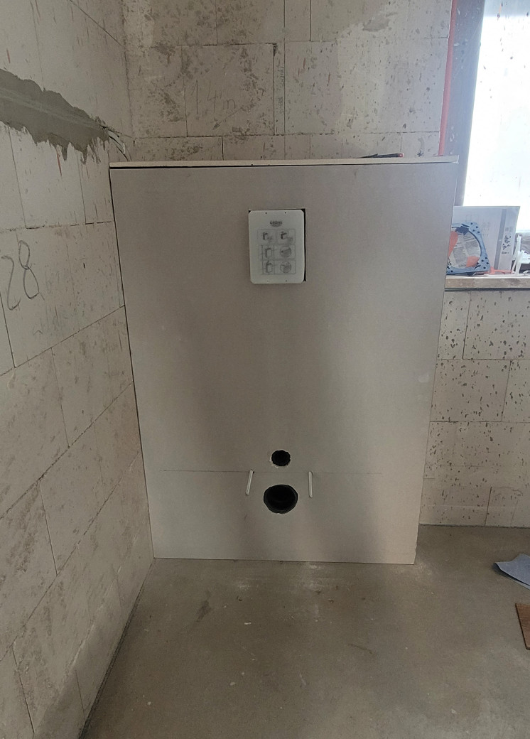Najpierw jednak obudowalismy stelarz podtynkowy Geberit, wysmarowalismy podloge hydroizolacja Atlas Woder W (poszlo 1,5 duzego wiaderka) i dodalismy jedno gniazdko na scianie za drzwiami by powiesic tam w przyszlosci maly grzejnik elektryczny.