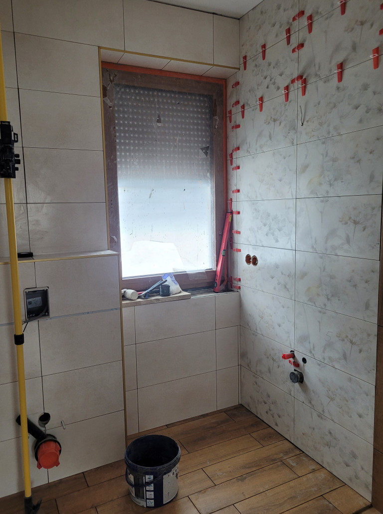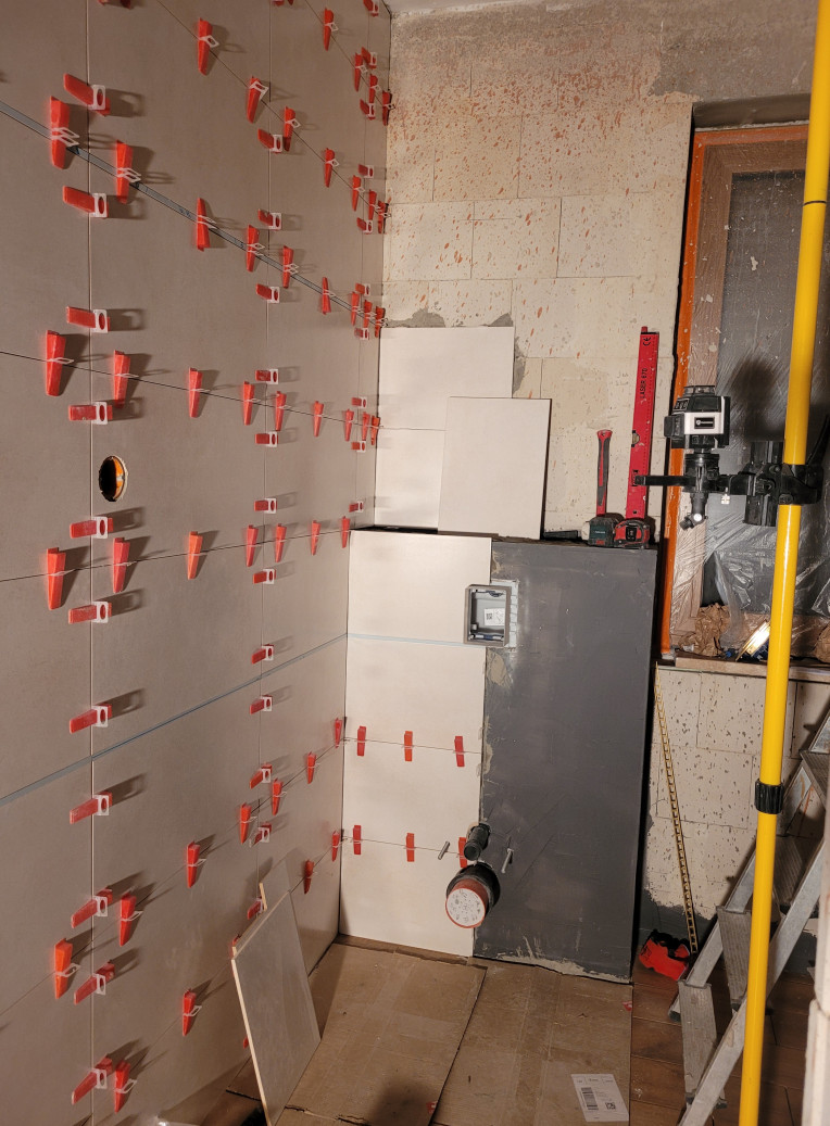 Zaczelismy od gresu na podlodze (15×61cm) i jednej ze scian pod prysznicem. Potem plytki na scianach 30x60cm.