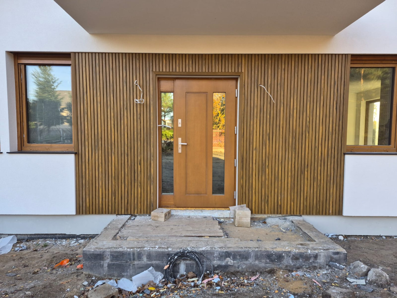 2. wybrane lamele na frontowej elewacji przyszly zupelnie w innym odcieniu niz przedstawiane na stronie producenta. Mialy byc sporo jasniejsze w kolor naszej podbitki, tymczasem oprocz tej samej nazwy ("dab antyczny") sa zupelnie innym kolorem, duzo za ciemne. Opozniona ich dostawa nie pozwolila na jakakolwiek zmiane w tym temacie. Musza zostac, popracuje nad nimi z pierwszym remontem jaki trzeba bedzie kiedykolwiek w przyszlosci zrobic. No chyba, ze przyzwyczaimy sie i polubimy z nimi po czasie ;)
